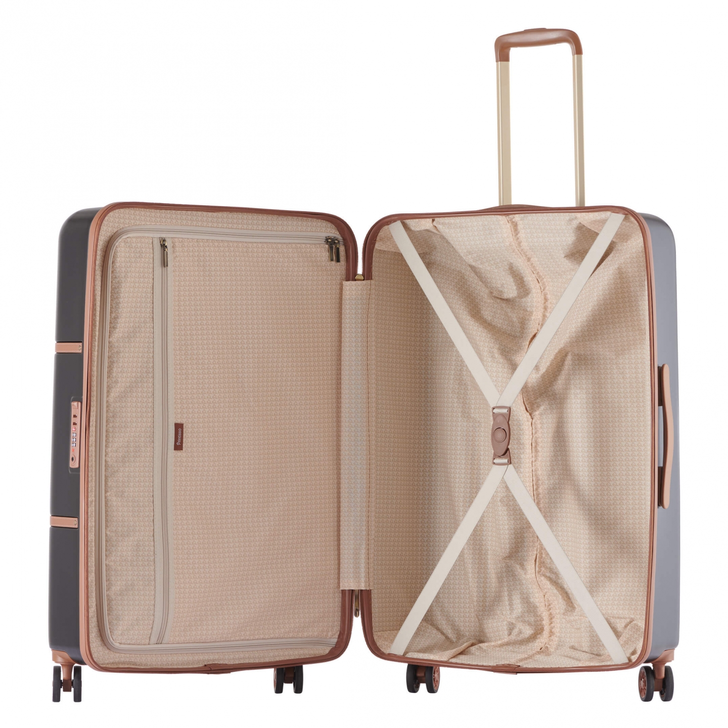 Denne kofferten har et luksuriøst og smart designet interiør. Først og fremst er kofferten inndelt i to rom, slik at det er enklere for deg å dele opp eiendelene dine. Da blir det lettere å finne det du leter etter. Det ene rommet kan lukkes med glidelås, og har i tillegg en stor lomme på yttersiden. Denne har også glidelås, og er perfekt til oppbevaring av mindre eiendeler. Det andre rommet har elastiske kryssremmer, som holder alt du har pakket ned i kofferten på plass. Fôret på innsiden har det eksklusive og ikoniske Pintisso P-mønsteret, som gir en følelse av luksus.