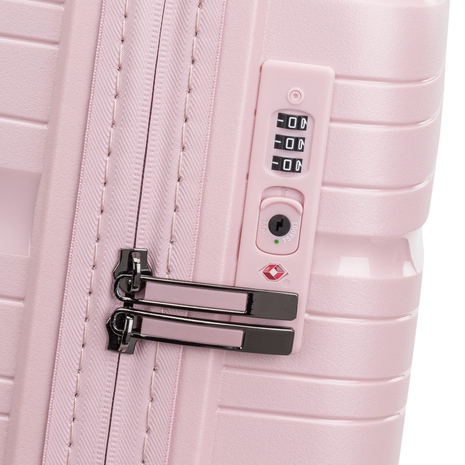 Et TSA-lås har en Travel Sentry-logo på seg. Den ser ut som en rød diamant som du kan se på bildet ovenfor. Alle TSA-lås er sertifisert av Travel Sentry Organization, som stiller høye krav til kvalitet og sikkerhet. TSA-lås lar deg velge en egen tre-sifret kodelås som du kan bruke til å låse og låse opp kofferten din, og holde bagasjen din trygt. På kofferten ser det ut som på bildet nedenfor.