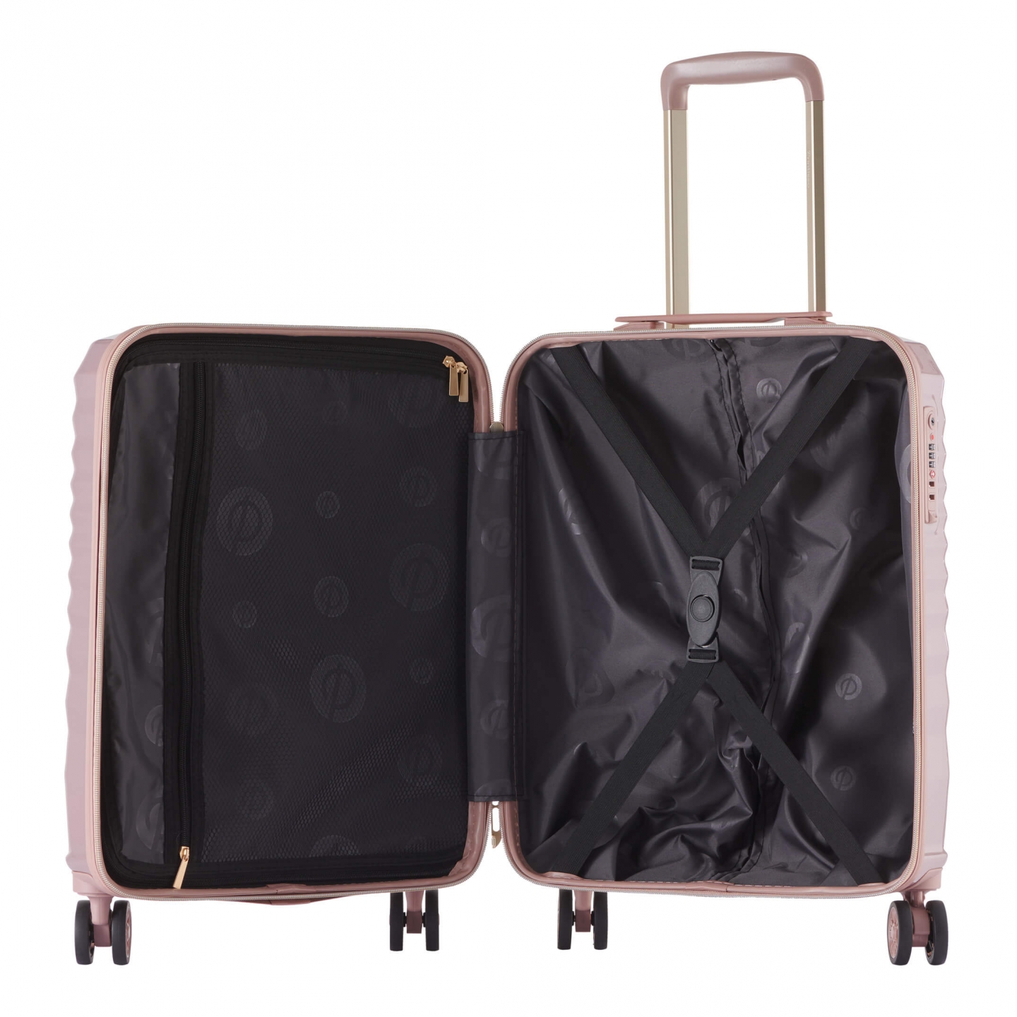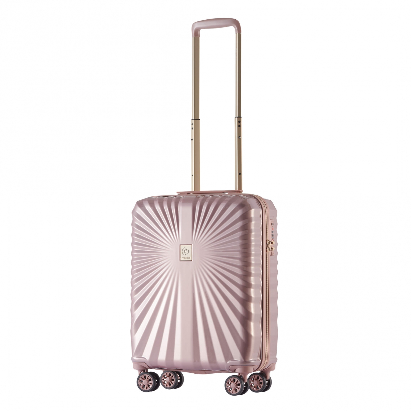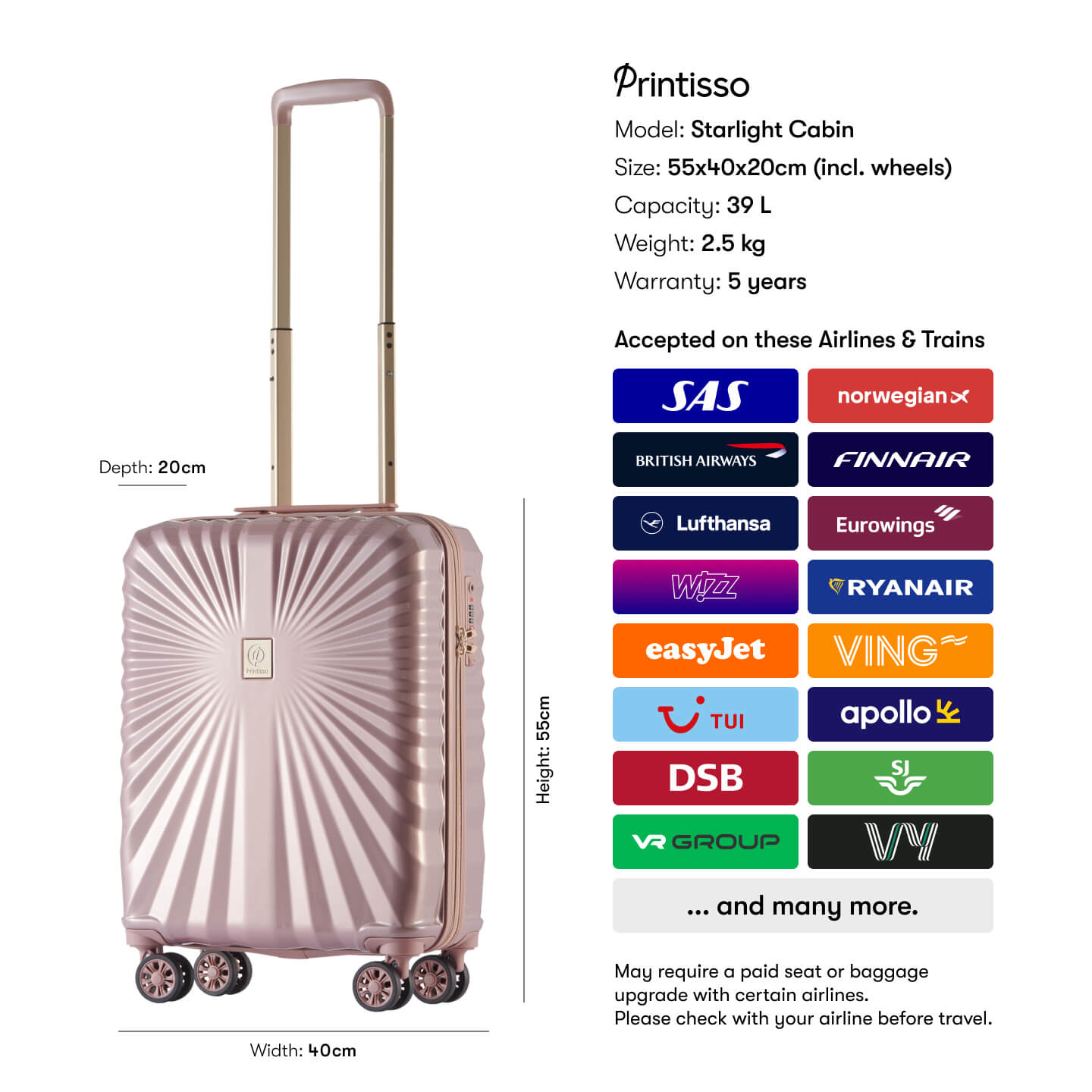 Printisso Starlight kabinkoffert er for deg som leter etter en unik og moderne koffert i høy kvalitet og med gjennomtenkte detaljer. Printisso Starlight-serien er laget av sterke, lette og holdbare materialer, som garanterer lang levetid. Kofferten kommer med en garanti på hele 5 år. Designet er inspirert av vakkert stjernelys, og det viser seg blant annet ved at det ser ut som om den matte metallogoen skinner av lys fra stjernene. Alle koffertens deler, som hjul, lås og håndtak, matcher koffertens ytre i stilig Romantic Rose. Dette, kombinert med det blanke skallet, gir kofferten et luksuriøst utseende. Drøm deg vekk på din neste reise, og velg din favorittkoffert. Denne mellomstore kofferten må sjekkes inn, og størrelsen er perfekt for en reise på 1 til 3 dager.
