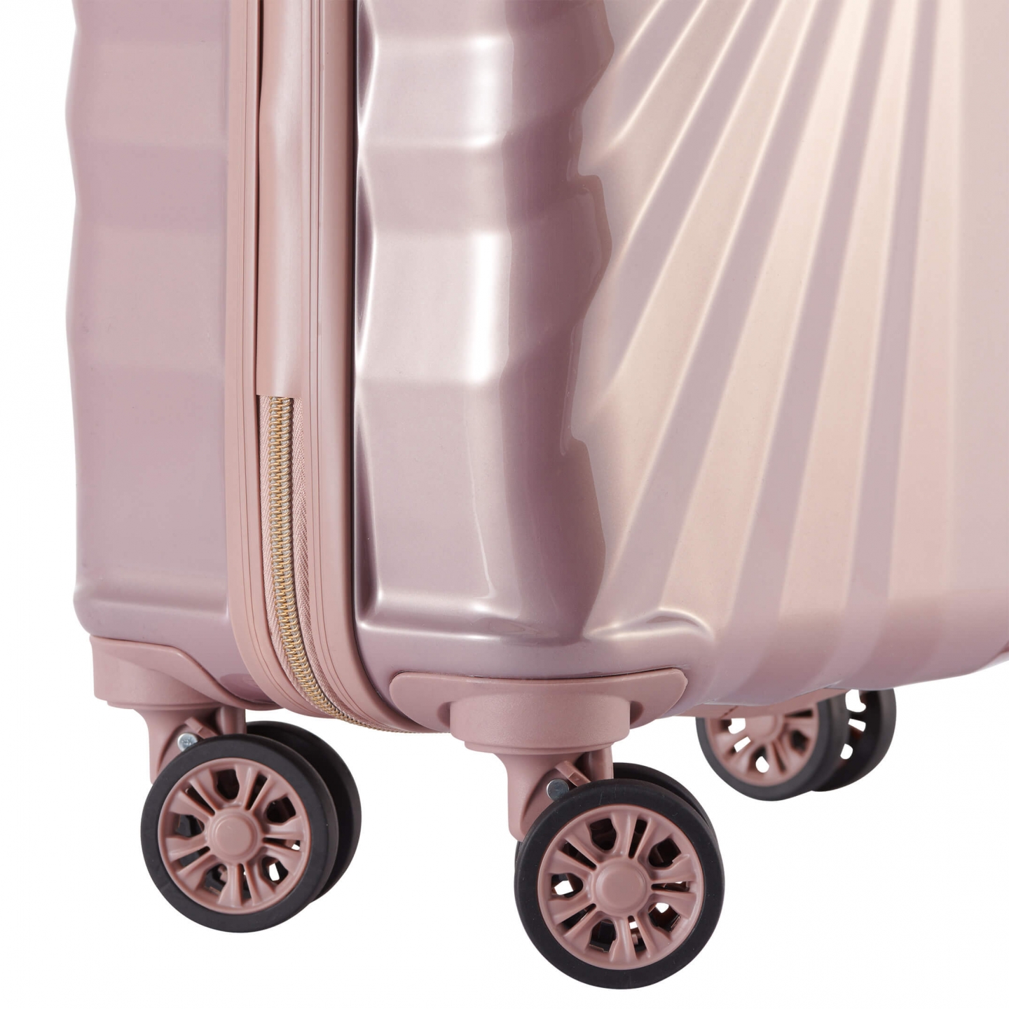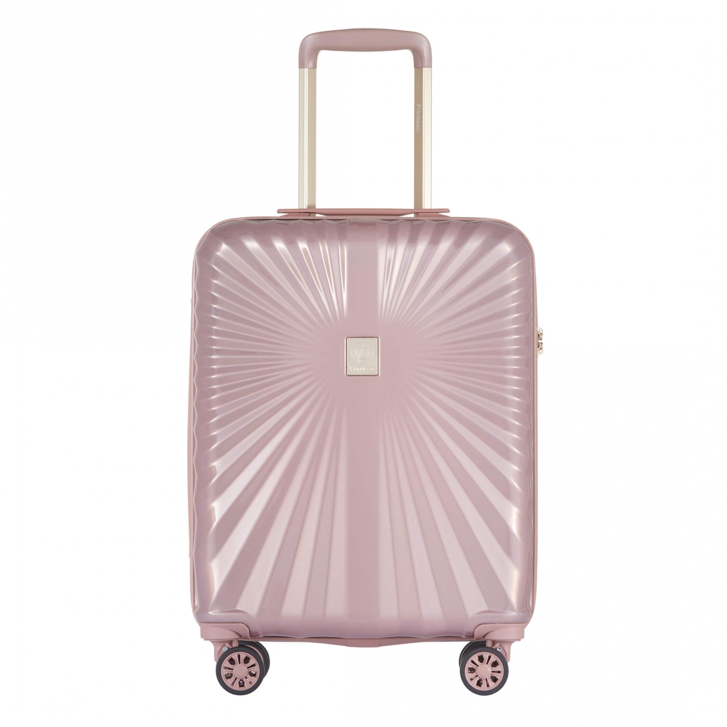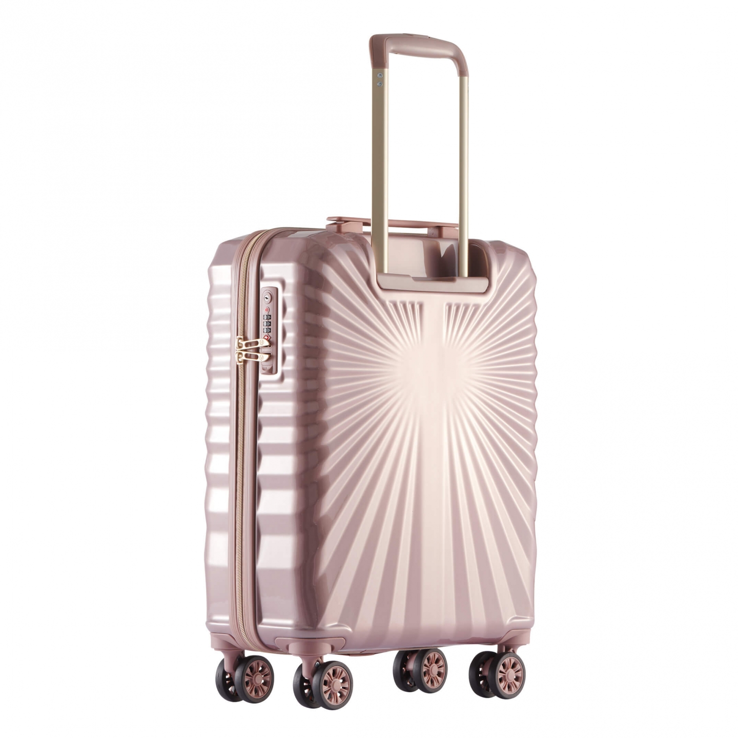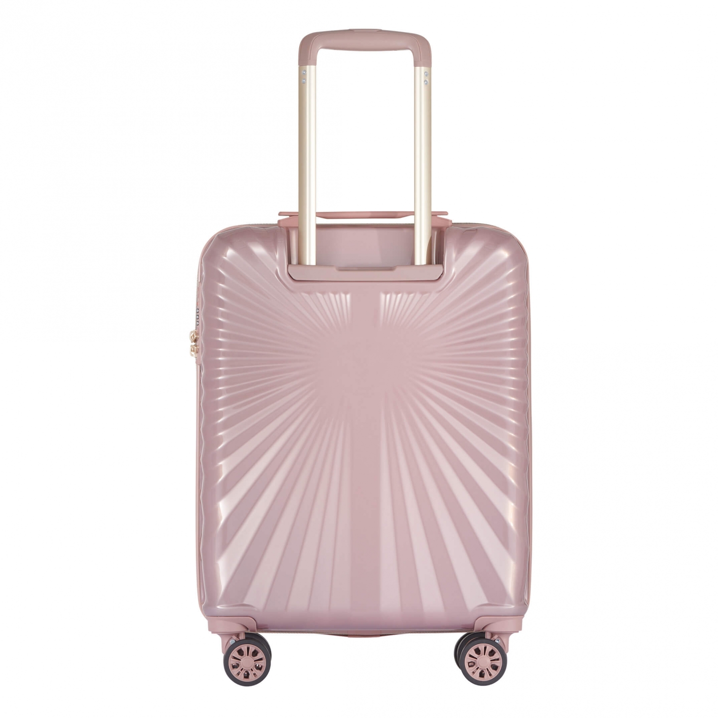 Printisso Starlight kabinkoffert er for deg som leter etter en unik og moderne koffert i høy kvalitet og med gjennomtenkte detaljer. Printisso Starlight-serien er laget av sterke, lette og holdbare materialer, som garanterer lang levetid. Kofferten kommer med en garanti på hele 5 år. Designet er inspirert av vakkert stjernelys, og det viser seg blant annet ved at det ser ut som om den matte metallogoen skinner av lys fra stjernene. Alle koffertens deler, som hjul, lås og håndtak, matcher koffertens ytre i stilig Romantic Rose. Dette, kombinert med det blanke skallet, gir kofferten et luksuriøst utseende. Drøm deg vekk på din neste reise, og velg din favorittkoffert. Denne mellomstore kofferten må sjekkes inn, og størrelsen er perfekt for en reise på 1 til 3 dager.