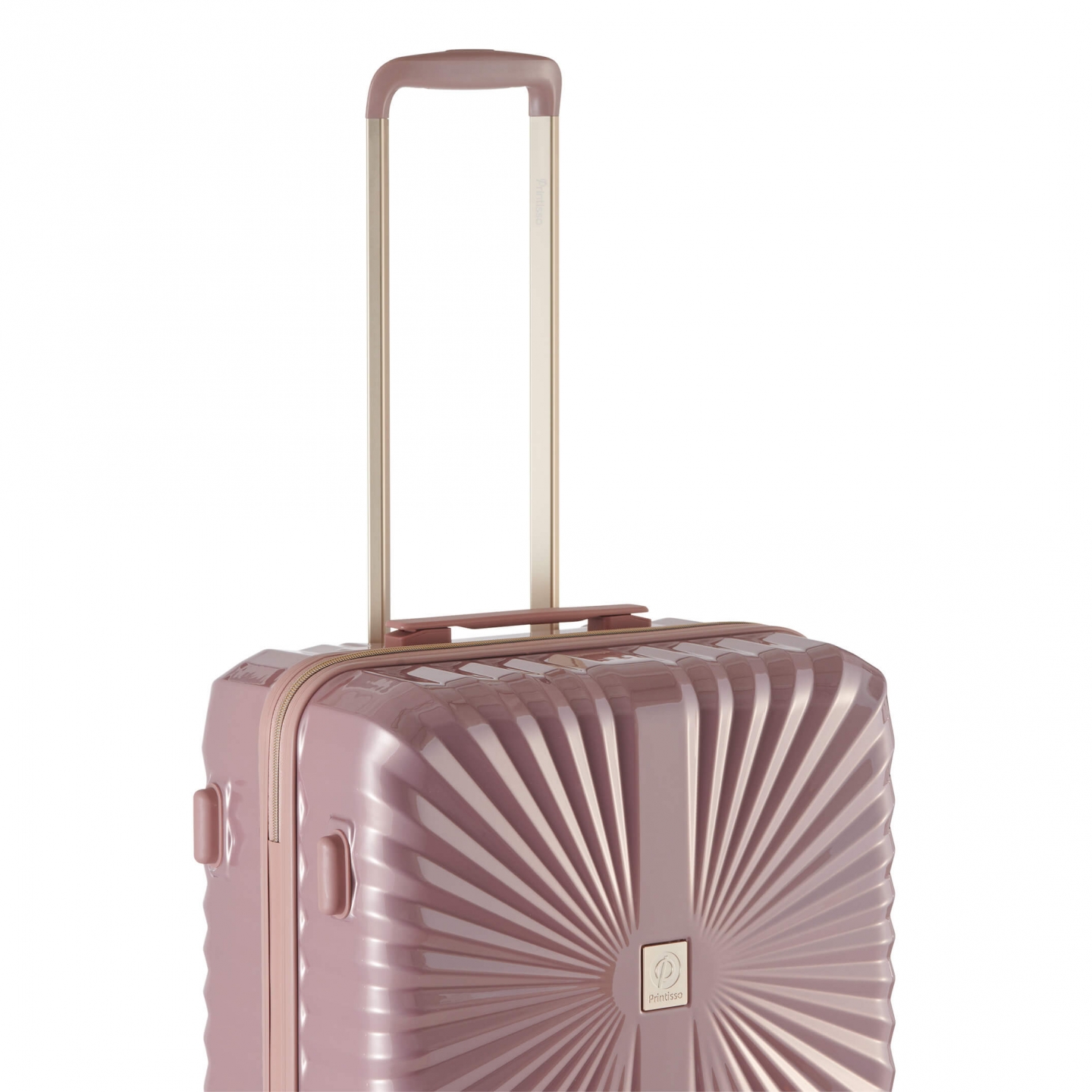 Teleskophåndtaket på denne mellomstore kofferten er stabilt og justerbart, og kan stilles inn på flere nivåer. Skinnen er i matt gull med et håndtak som matcher koffertens farge i Romantic Rose. Det er behagelige bærehåndtak på toppen. Disse matcher kofferten, og gjør den enklere å håndtere.