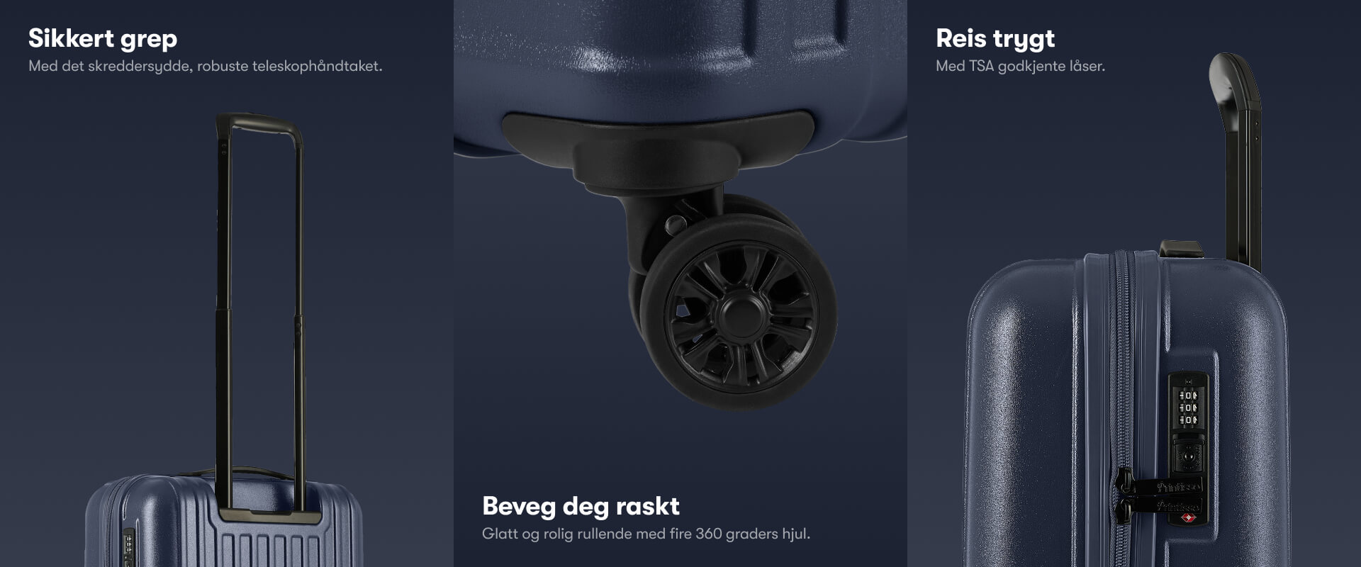 Teleskophåndtaket på Urbane er både stabilt og justerbart. I tillegg kan det trekkes ut i flere nivåer. Skinnen er i matt sort med matchende håndtak. Kabinvesken har et behagelig bærehåndtak øverst, slik at den er enkel å håndtere.