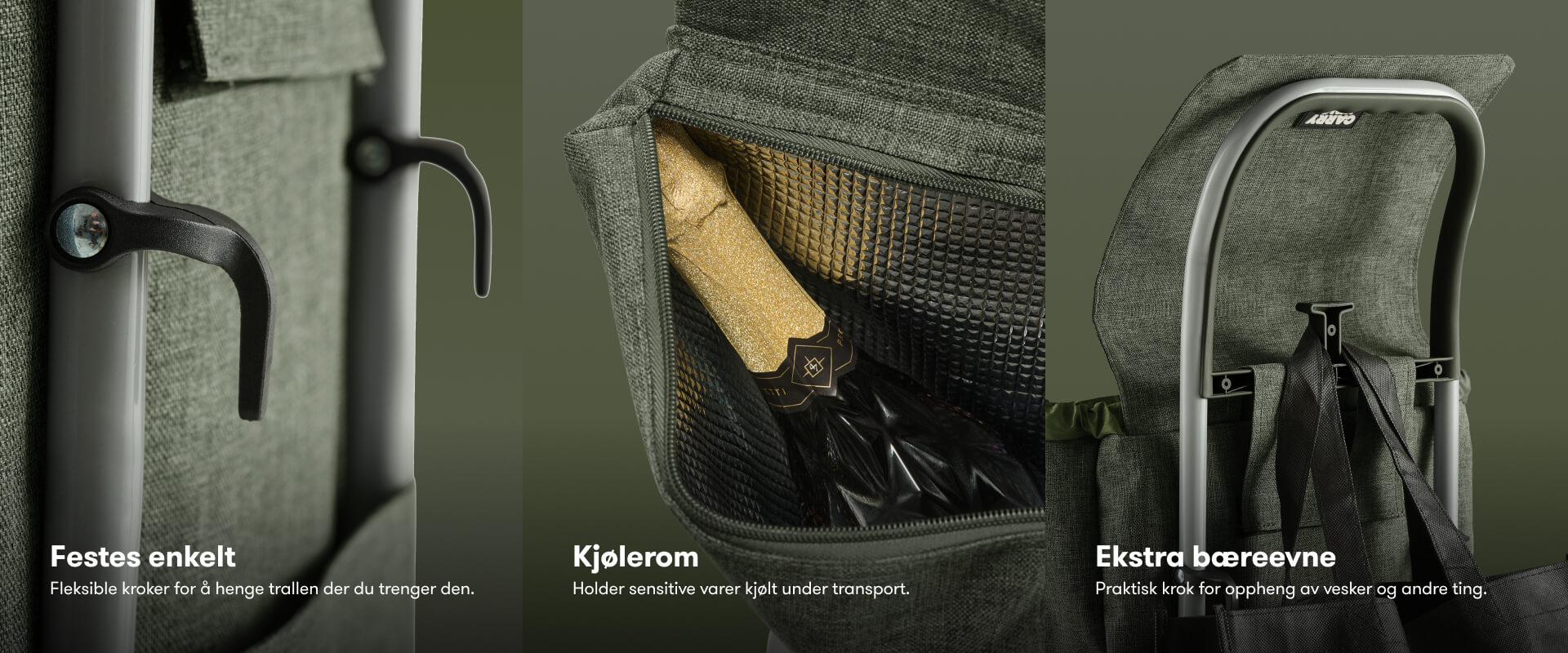 CarryKing Comfort handlevogn er en moderne, komfortabel og funksjonell handlevogn av høy kvalitet som gjør alle dine ærender enklere. Handlevognen lukkes med snøring for optimal komfort. CarryKing Comfort skiller seg ut med sine smarte funksjoner. Et magnetisk lokk som enkelt festes i trekkhåndtaket gjør det lett å fylle og tømme handlevognen. Kroker på baksiden av rammen gjør det mulig å henge handlevognen på butikkvognen mens du handler. På forsiden finnes et lukket kjølerom for kjølevarer. Det er også en sidelomme for paraply.