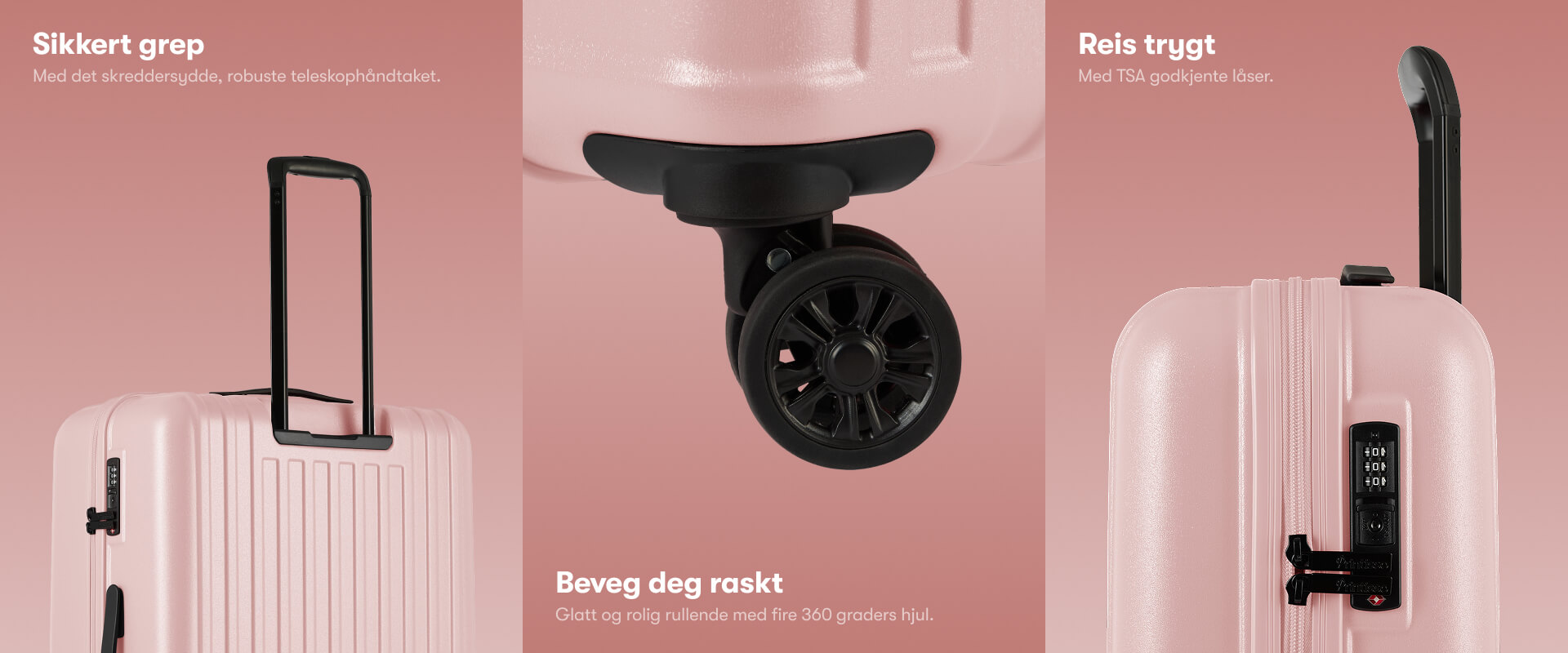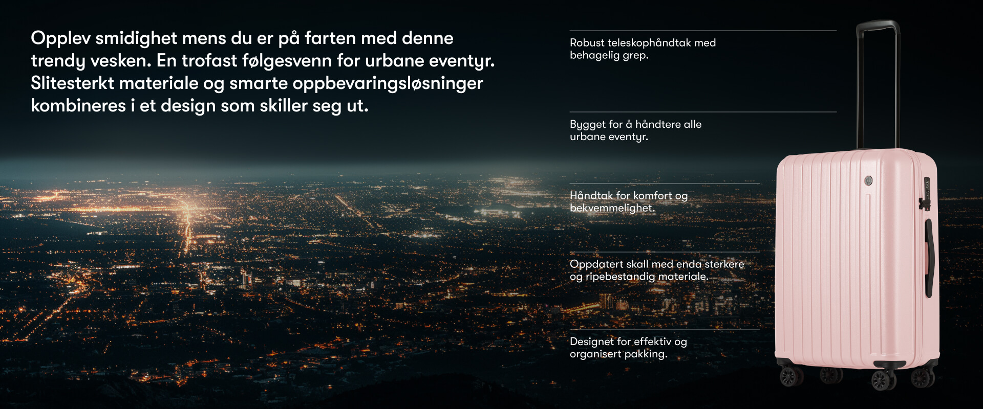 Printisso Urbane er for deg som ser etter en lett, slitesterk og stilren koffert. Urbane er produsert i et hardt, lett og slitesterkt materiale, som garanterer lang levetid. Den omfattende garantien gjelder i hele 5 år. Koffertens design er tidløs med hjørner som er spesielt designet for å gi deg maksimalt med pakkevolum og beskyttelse mot støt. Urbane-serien kommer i 6 flotte farger. Dagdrøm om den neste reisen din med den stilrene kofferten i fargen Soft Pink. En kabinkoffert passer utmerket for reiser som varer i en til fire dager. En mellomstor koffert passer utmerket for reiser som varer i fire til sju dager. En stor koffert passer utmerket for reiser som varer i sju til fjorten dager. Koffertene leveres i stilige dustbags som beskytter dem under transport og lagring.