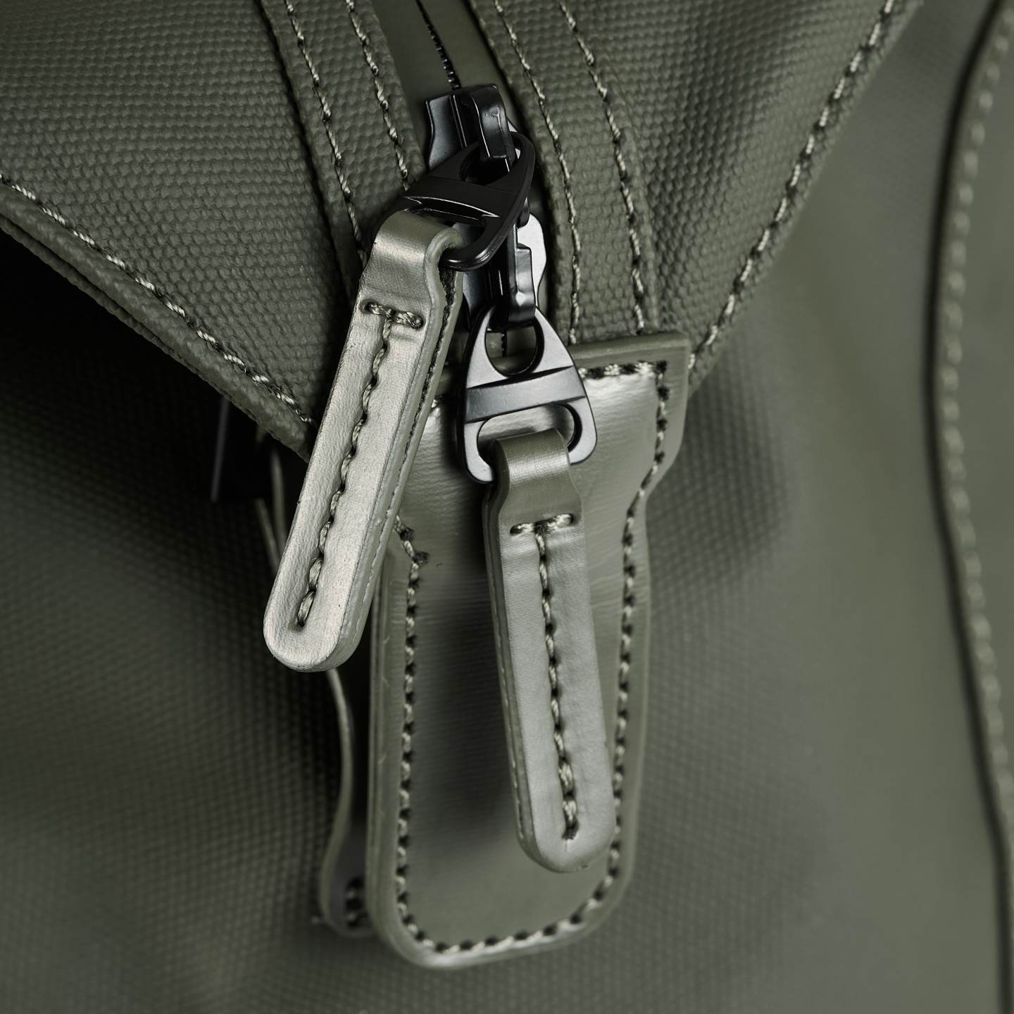 Takket være materialets tette veving og beskyttende voksfinish blir bagen lett, holdbar og motstandsdyktig i all slags vær. Den har også tette glidelåser som hjelper med å beskytte innholdet. Bagen står stødig takket være små føtter på undersiden, noe som minimerer slitasje. Du har også mulighet til å låse bagen (lås medfølger ikke) for ekstra trygghet på reise. På forsiden finnes en praktisk frontlomme for rask tilgang til eiendelene dine. På baksiden finnes i tillegg en smart rem som gjør at bagen enkelt kan festes på teleskophåndtaket på kofferten din.