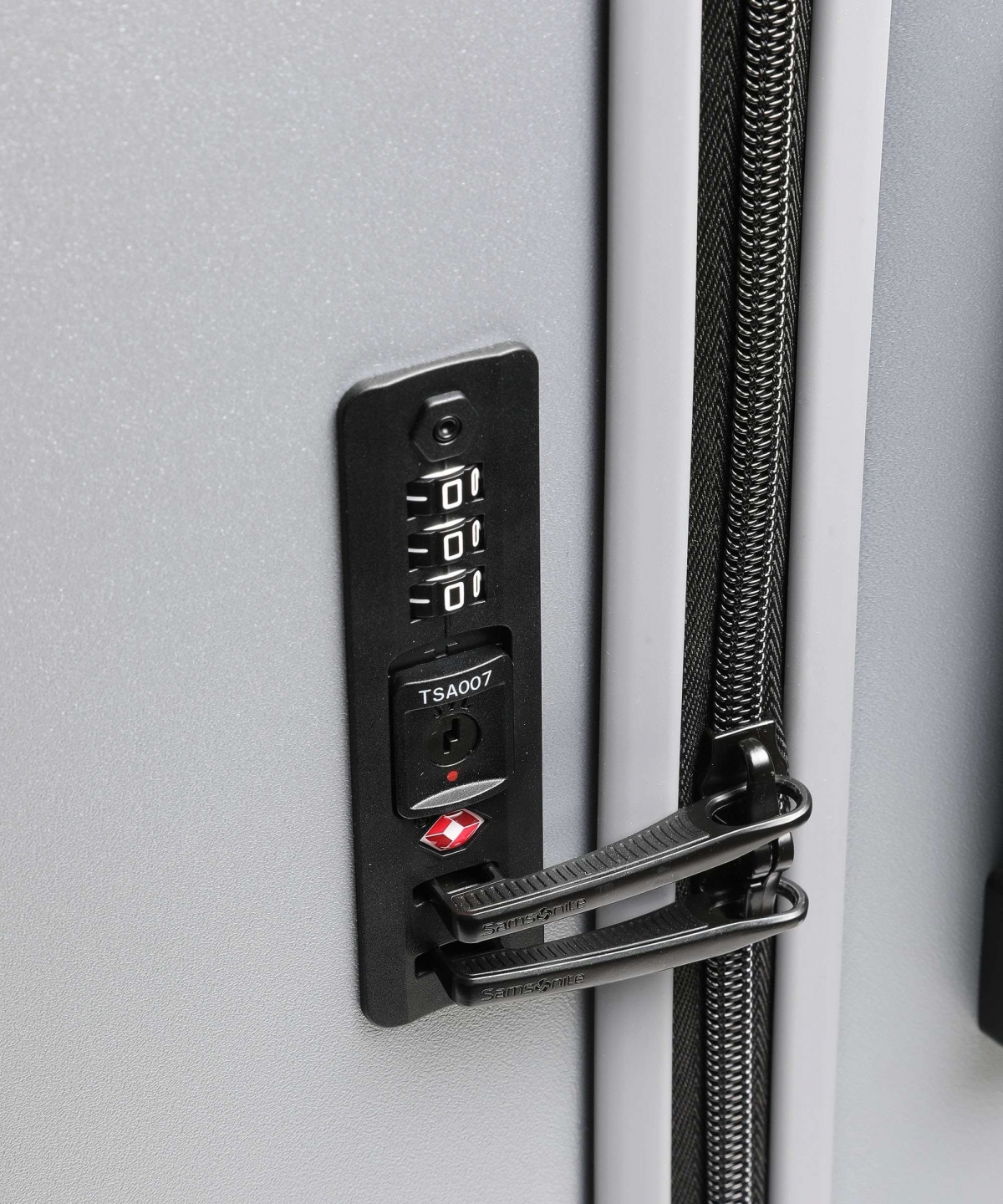 Integrert tresifret TSA-kodelås. Merk at nøkkelen kun kan innehas av tollvesenet. Flat avtrekker i glidelåsen for bedre beskyttelse mot støt.