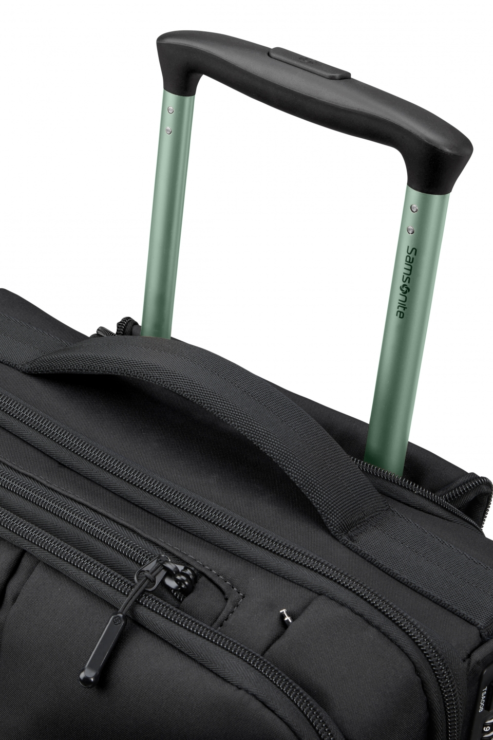Teleskophåndtaket har to skinner som gjør duffelvesken stabil å trekke. Vesken har også bærehåndtak på toppen, bunnen og siden for enkel håndtering.