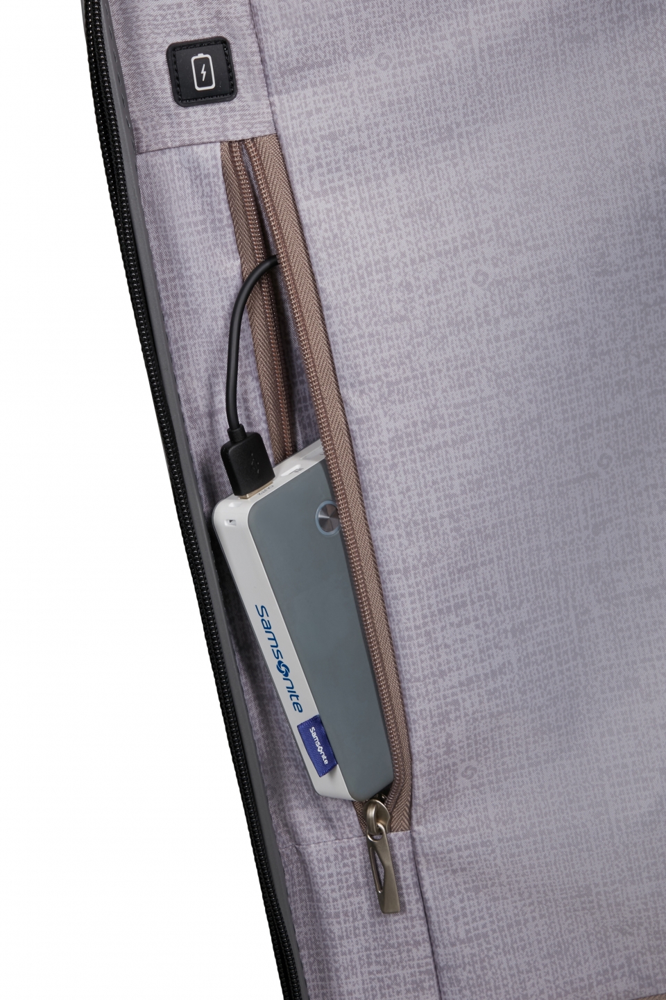 Velorganisert innside, der pakkingsplassen maksimeres. Elastiske nedre kryssbånd som holder bagasjen på plass. Stor innerlomme med glidelås. Integrert USB-port med Powerbank-lomme (Powerbank ikke inkludert). Innerforet er laget av resirkulerte RPET-flasker. Det finnes også en skillevegg i lokket som gjør pakkingen enkel.