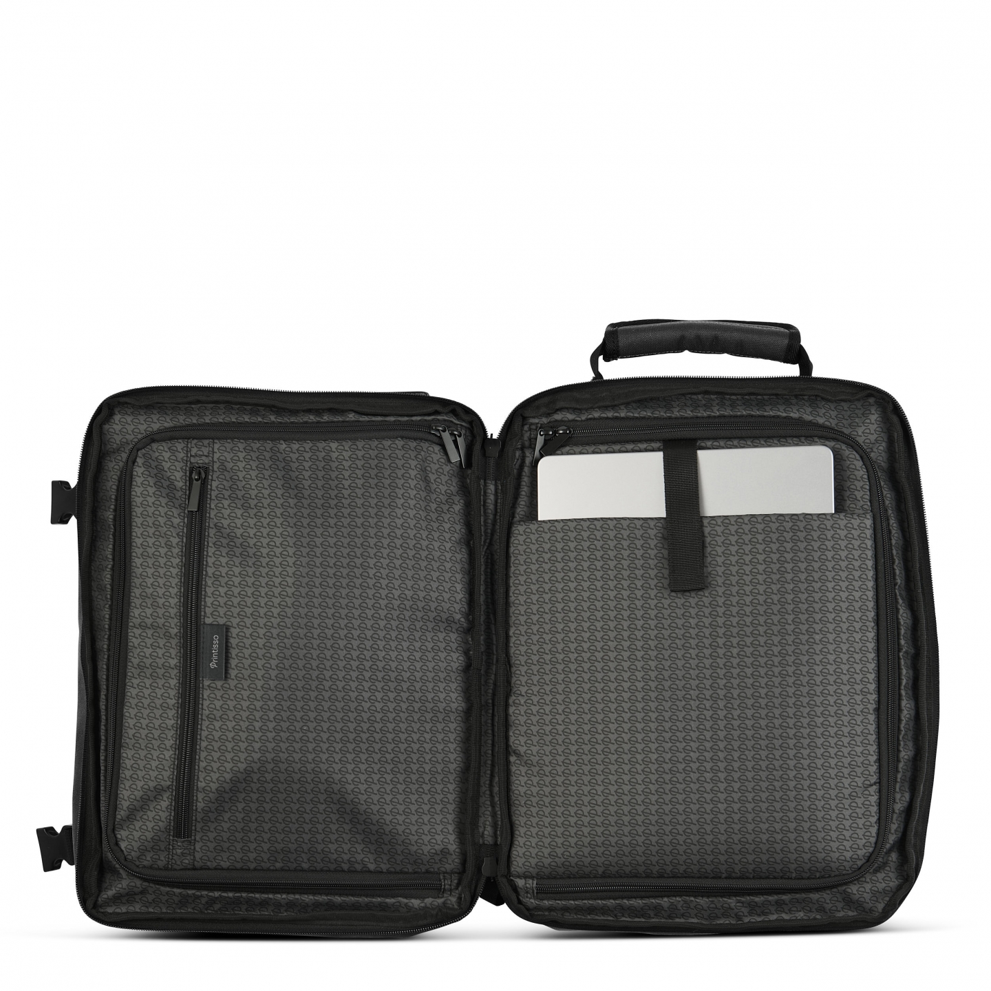 Inni finnes to lukkbare lommer som gjør det enkelt å organisere eiendelene dine. En polstret lomme er spesielt laget for laptop eller nettbrett, og i tillegg finnes en mindre lomme for små reiseartikler. Innsiden er gjennomgående dekorert med Printissos klassiske P-monogram.
