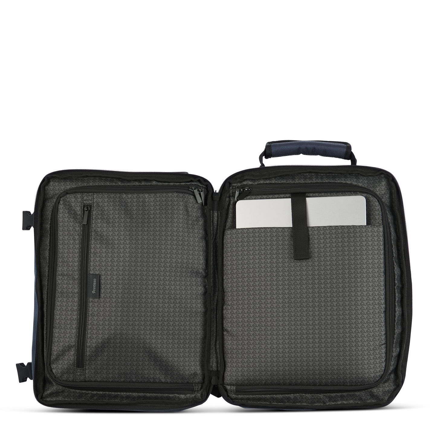 Inni finnes to lukkbare lommer som gjør det enkelt å organisere eiendelene dine. En polstret lomme er spesielt laget for laptop eller nettbrett, og i tillegg finnes en mindre lomme for små reiseartikler. Innsiden er gjennomgående dekorert med Printissos klassiske P-monogram.