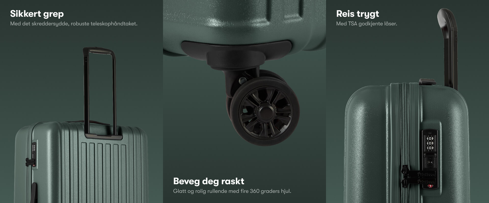 Kofferten har en innebygget, tresifret TSA-kodelås for en sikker reise. Vær oppmerksom på at TSA-nøkler er forbeholdt tollvesenet, og at de dermed IKKE følger med kofferten. Glidelåsen er designet slik at den er beskyttet mot støt.