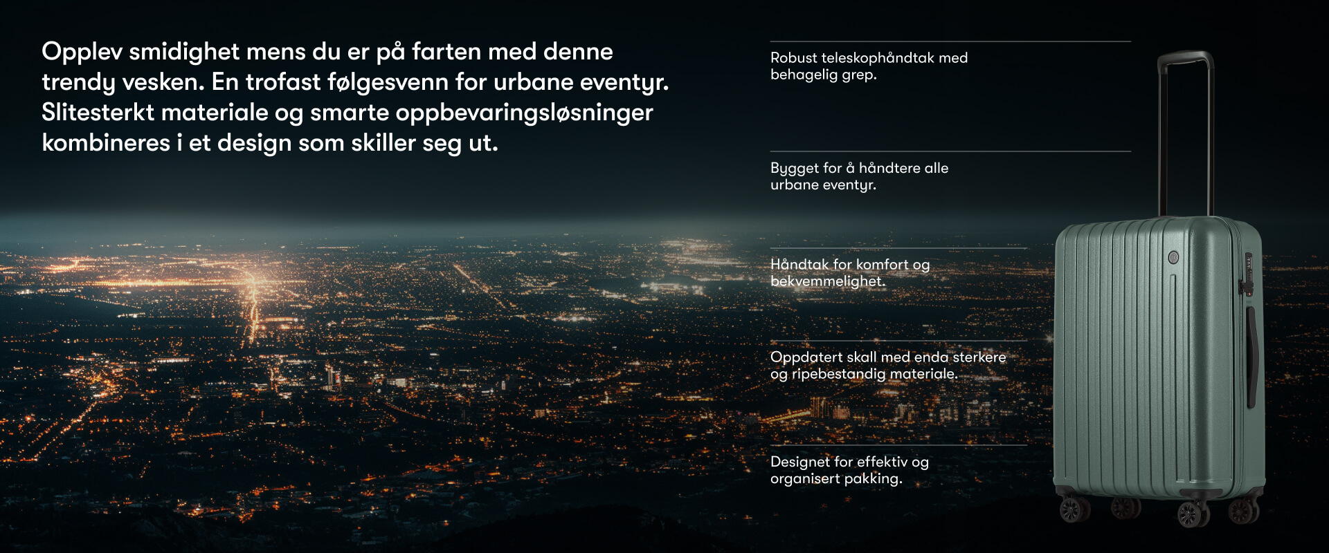 Printisso Urbane er kofferten for deg som ser etter en lett, slitesterk og stilren mellomstor koffert, som kan inneholde litt av hvert. Urbane er produsert i et hardt, lett og slitesterkt materiale, som garanterer lang levetid. Den omfattende garantien gjelder i hele 5 år. Koffertens design er tidløs med hjørner som er spesielt designet for å gi deg maksimalt med pakkevolum og beskyttelse mot støt. Urbane-serien kommer i 10 flotte farger. Dagdrøm om den neste reisen din med den stilrene kofferten i fargen Shadow Green. Koffertens dimensjoner gjør at du kan sjekke den inn hos alle flyselskaper. Den er perfekt når du skal være på reise i 4-7 dager, men den er også velegnet til både tog- og bilreiser. Kofferten leveres i en stilig dustbag som beskytter den under transport og lagring.