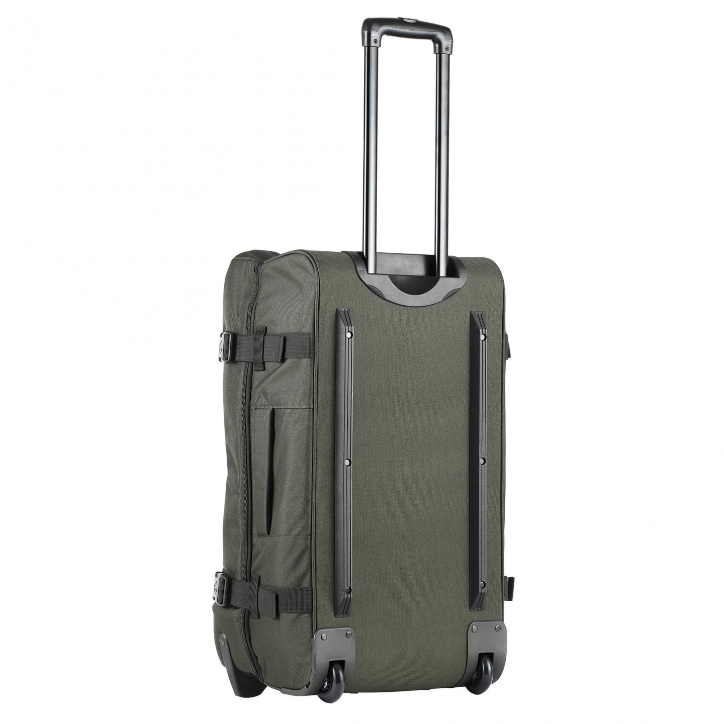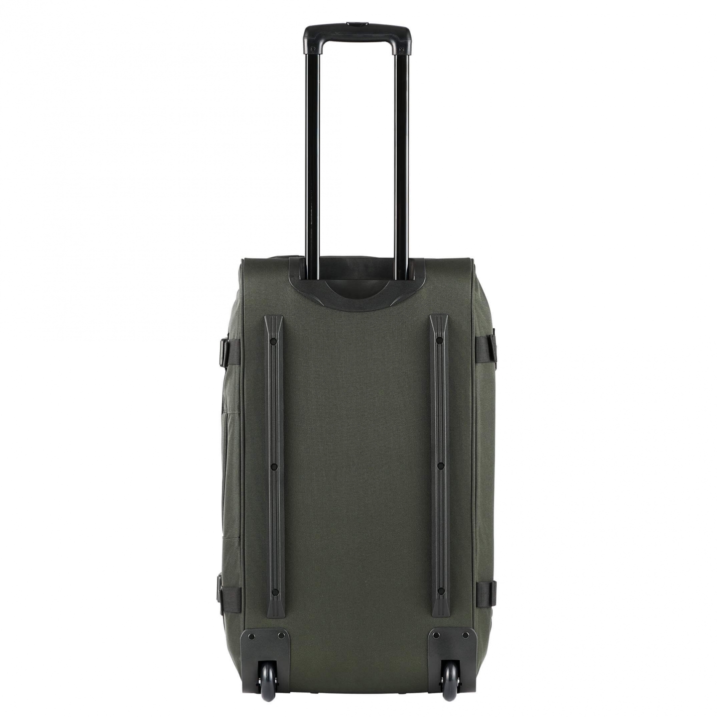 Teleskophåndtaket er stabilt og justerbart på flere nivåer. Skinnen er i mattsvart med matchende håndtak. Bærehandtak finnes på forsiden, toppen, siden og bunnen for enkel håndtering.